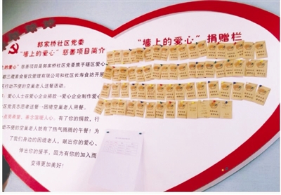 “墻上的愛心”慈善公益項(xiàng)目,是郭家橋社區(qū)黨委在街道黨工委支持下,攜手轄區(qū)愛心企業(yè)成都三藏素食餐飲管理有限公司和社區(qū)長壽食坊開展的為社區(qū)困境空巢老人送餐活動(dòng)。以餐飲店為載體,前來消費(fèi)的市民自愿獻(xiàn)愛心,每留下一碗素食的錢,墻上的捐贈(zèng)欄就會(huì)貼上一個(gè)愛心標(biāo)簽;然后由企業(yè)用捐贈(zèng)的錢制作愛心餐,交給社區(qū)黨員志愿者為困境空巢老人送餐。